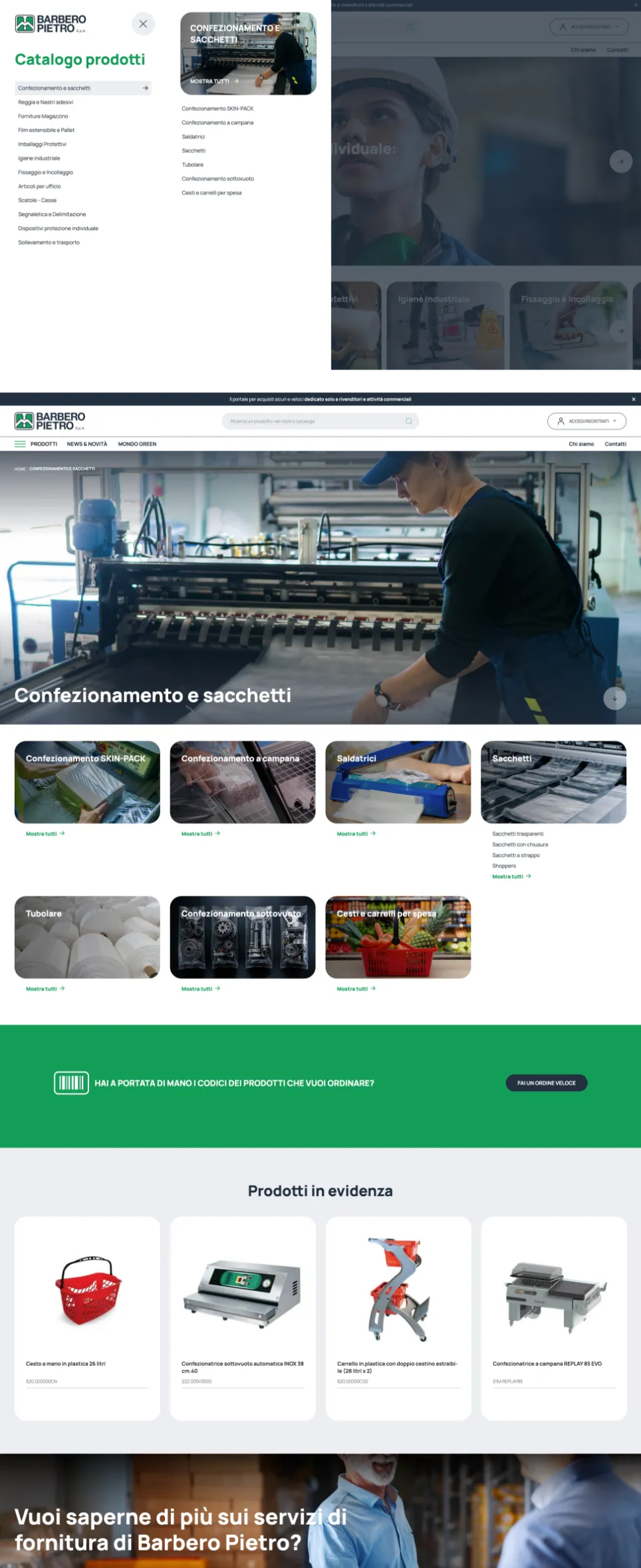 Nella progettazione dell’interfaccia abbiamo privilegiato un approccio pragmatico orientato all’efficienza operativa: navigazione semplificata tra le categorie merceologiche, ricerca avanzata per trovare rapidamente i prodotti all’interno del vasto catalogo e un design che riflette l’identità di Barbero Pietro mantenendo al centro la funzionalità.