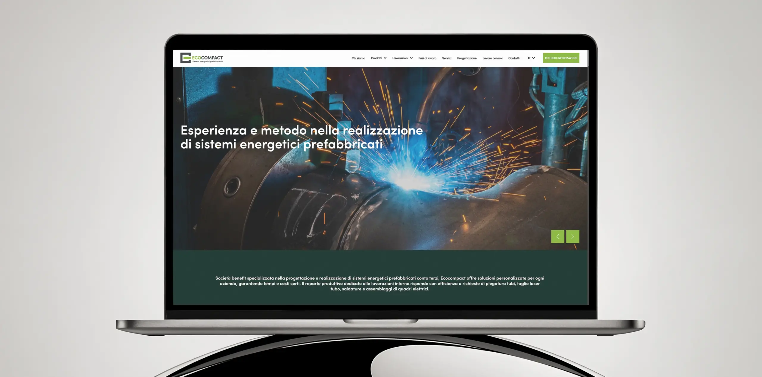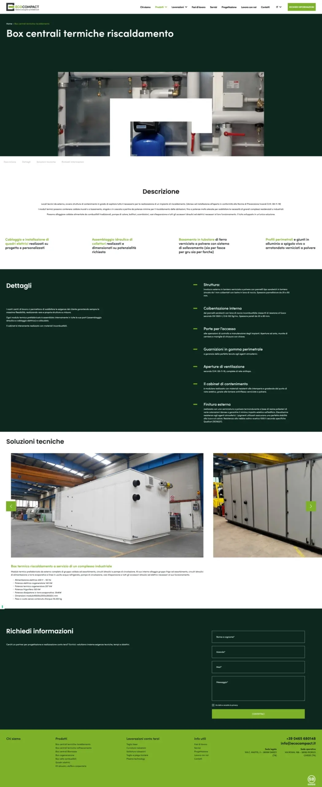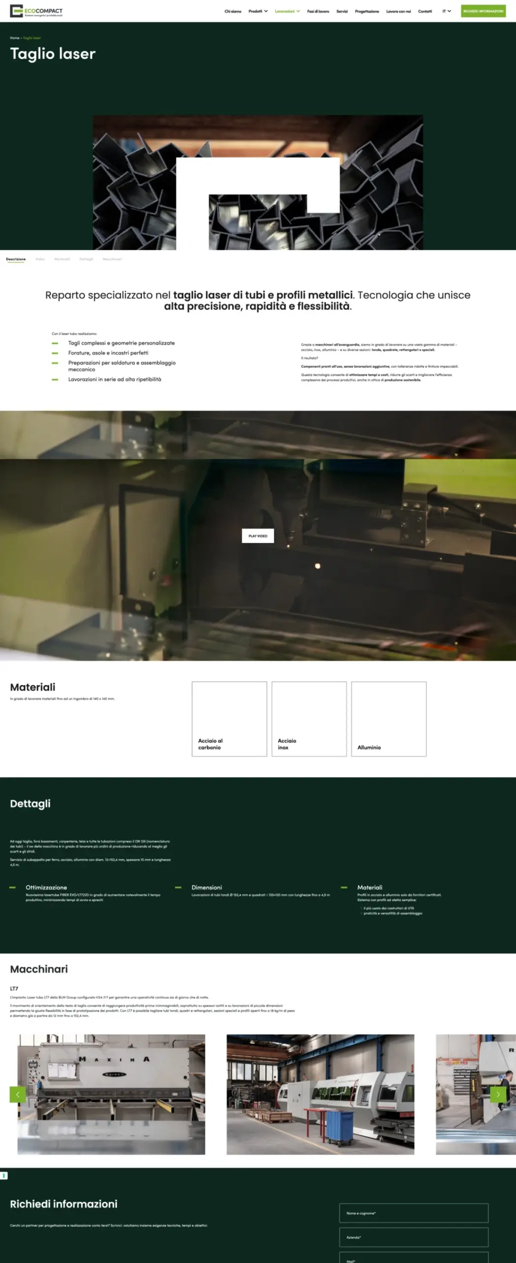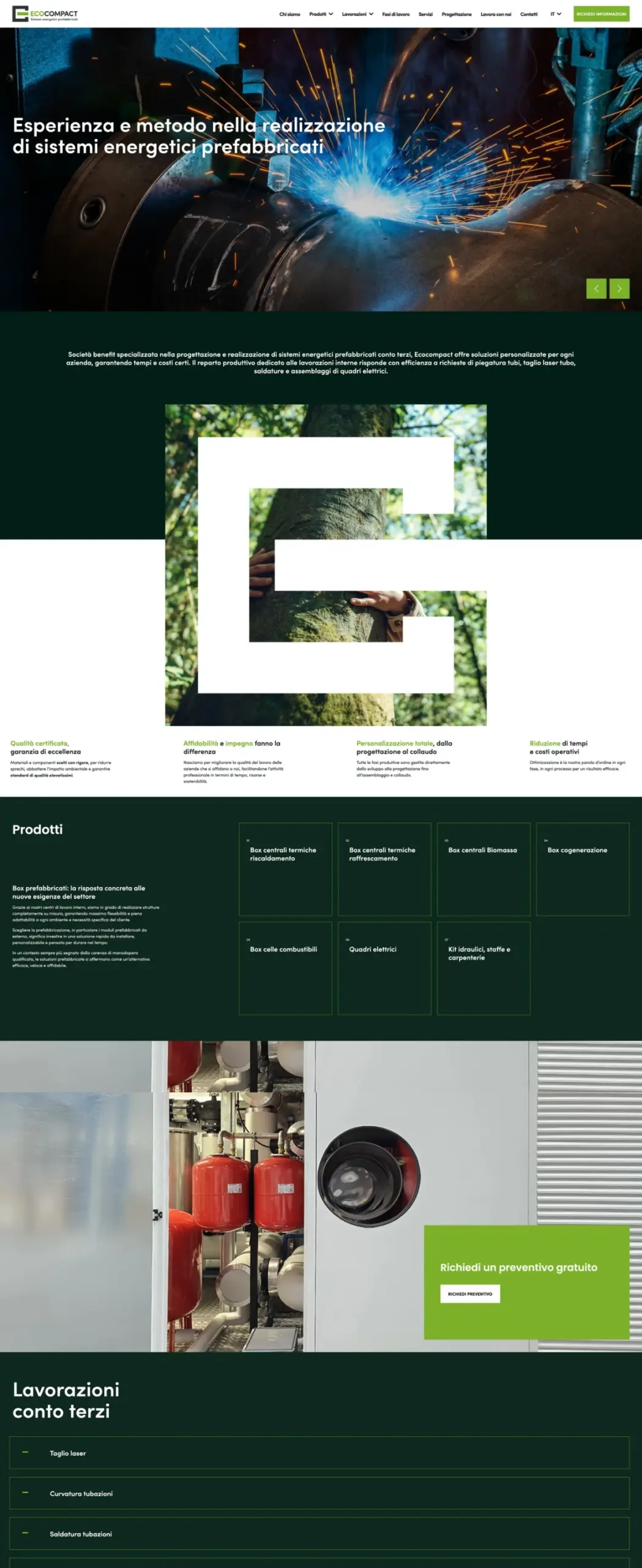 La risposta ha guidato la costruzione dell’architettura informativa. I prodotti sono organizzati in sottopagine dedicate a ciascuna tipologia: box per centrali termiche, sistemi per biomassa, cogenerazione, celle combustibili, quadri elettrici e kit idraulici. Le lavorazioni interne – taglio laser, curvatura e saldatura tubazioni, taglio e piega lamiere, plasma technology – hanno una sezione autonoma che racconta le capacità produttive dell’azienda nel dettaglio. Fasi di lavoro, Servizi e Progettazione completano la navigazione, offrendo all’utente una visione strutturata e completa del metodo Ecocompact.