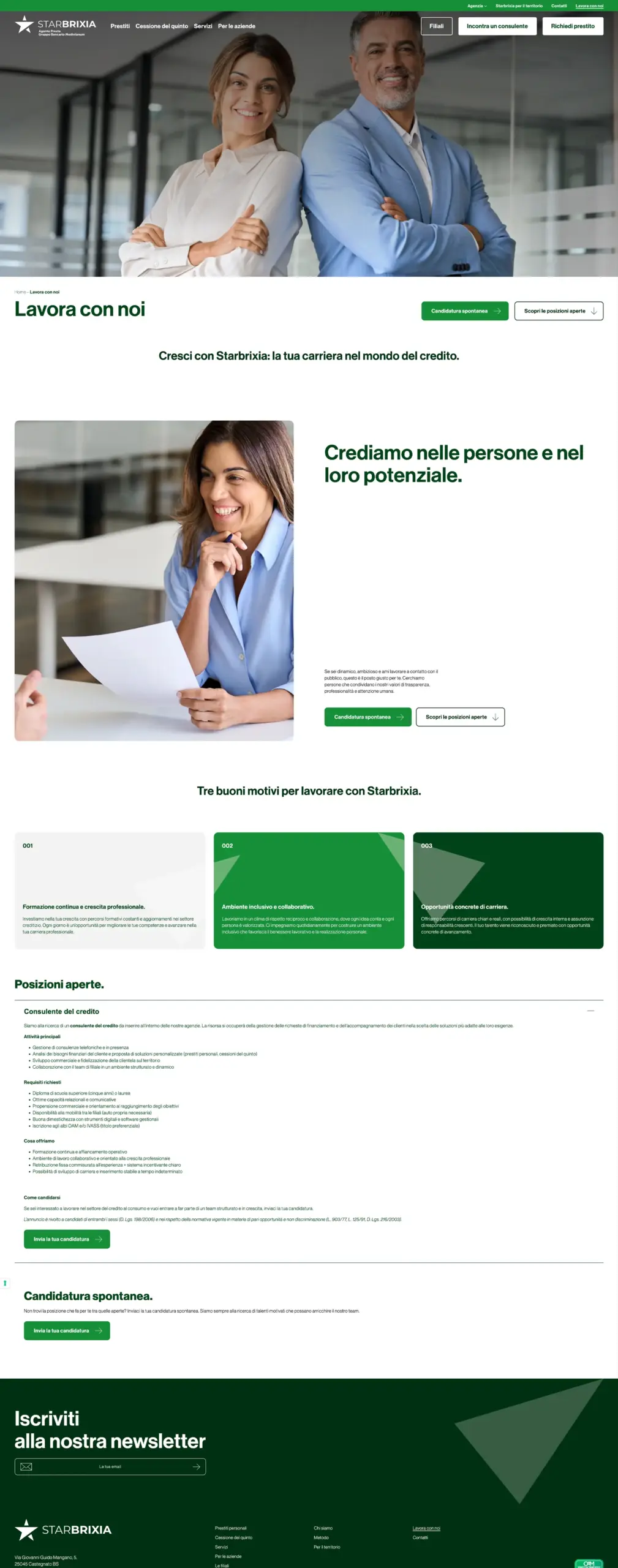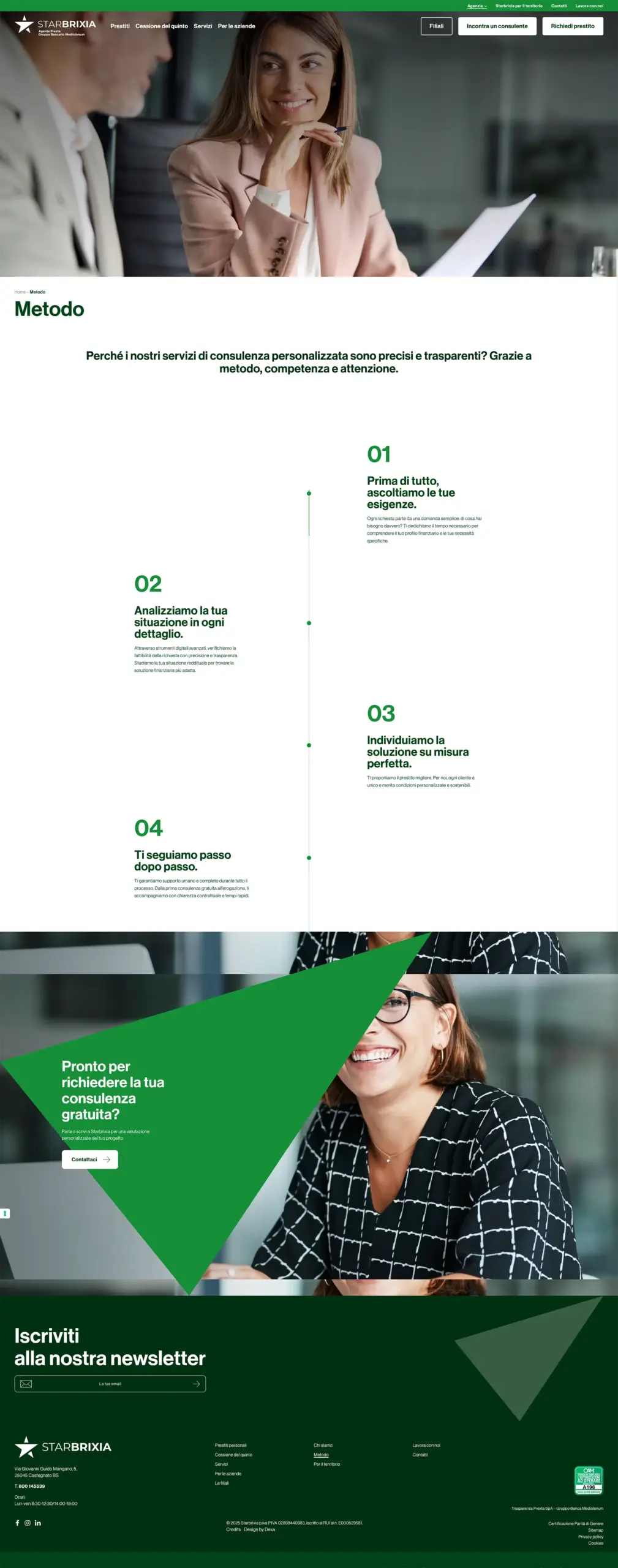 Abbiamo costruito una piattaforma che racconta Starbrixia esattamente per quello che è: una realtà radicata sul territorio, con 18 filiali e consulenti veri che conosci per nome e cognome. L’architettura del sito riflette questo approccio, infatti tutto è organizzato per far emergere la dimensione umana dell’azienda, dal menu principale che presenta i servizi principali alle sezioni che spiegano il metodo di lavoro, fino alla mappatura completa delle sedi.